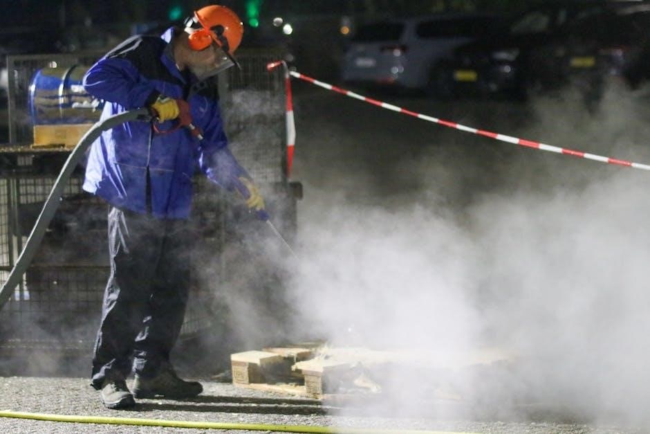 The Simpson 3000 PSI Pressure Washer features warning labels and symbols to alert users of potential hazards. These labels are strategically placed on the unit, such as near the engine, pump, and high-pressure hose. Symbols may include warnings for high pressure, hot surfaces, and moving parts. Always take time to understand these indicators, as they are critical for safe operation. For example, a label with a hand under a water jet signifies the danger of high-pressure spray. Familiarize yourself with all symbols and text to avoid accidents. Refer to the owner’s manual for explanations of specific warnings. Adhering to these cautions ensures a safer experience while using the pressure washer.